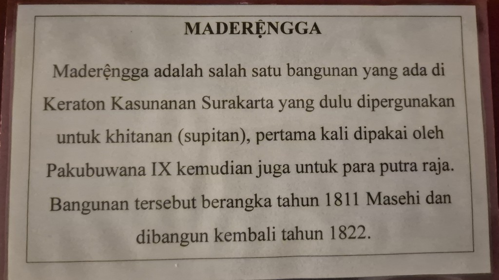 Das Museum (offiziell „Museum Suaka Budaya Keraton Kasunanan Surakarta) bietet tiefe Einblicke in die javanische Königsgeschichte, Kunst und Spiritualität.Erbaut ursprünglich 1745 als Teil des königlichen Palasts, später umgewidmet zum Museum. Zu sehen gibt es königliche Artefakte wie Keris (Dolche), königliche Kleidung, Masken, Gamelan-Instrumente, Porzellan, Möbel, prunkvolle königliche Kutschen (Kereta Kencana), Fotos & Gemälde sowie Porträts der Susuhunan (Könige) von Pakubuwono I bis XIII. Ebenso finden wir hier religiöse Objekte wie Hindu-Buddhistische Statuen, islamische Manuskripte, Kolonialzeit-Artefakte. Guide-Service ist im Eintrittspreis enthalten. Die Atmosphäre ist ruhig, spirituell, mit kolonialem Flair. Es gibt Kleidungsvorschriften: Keine Shorts, Sonnenbrillen, Hüte oder Jacken - Sarongs können ausgeliehen werden. Fotospots: Siti Hinggil Lor (Thronhalle) und Sasana Sumewa (Bronzekanone Kyai Rancawara). (06-12)