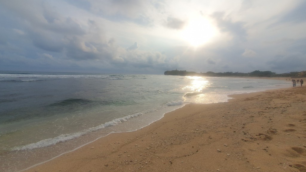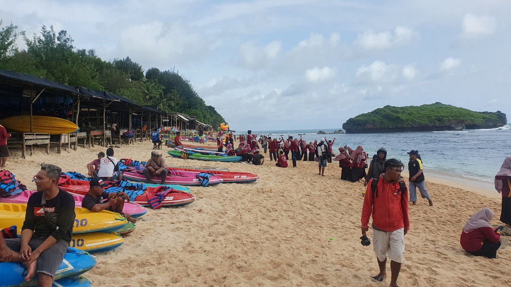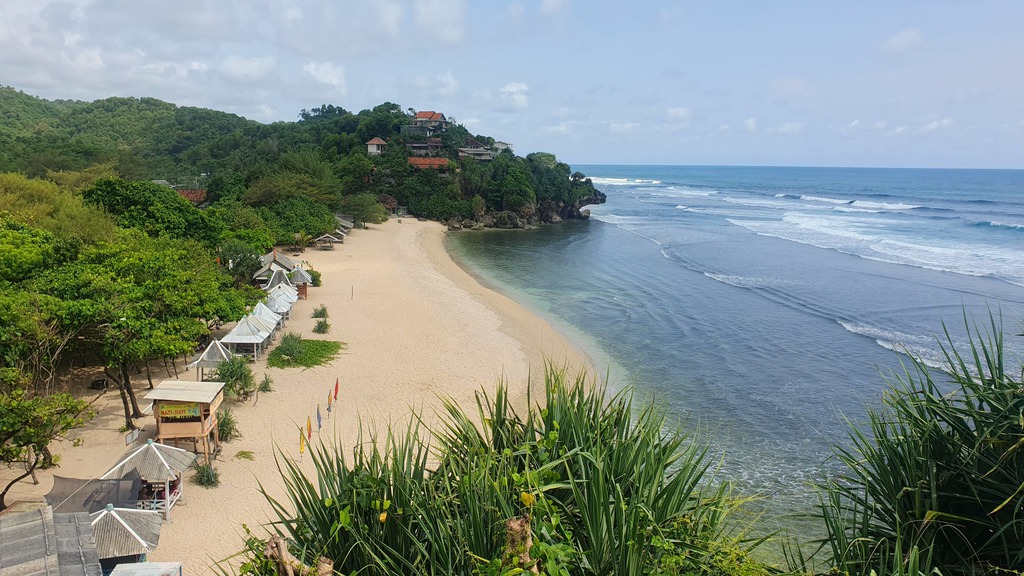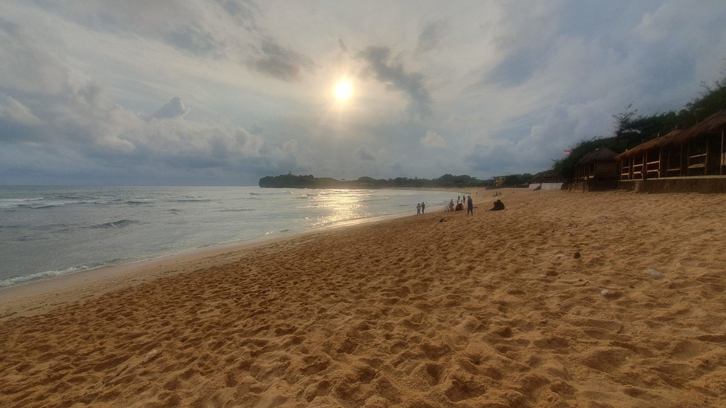Die Bucht bietet ruhiges Wasser, schöne Ausblicke und lokale Atmosphäre. Feiner, goldener Sand in einer geschützten Bucht – ideal zum Schwimmen, Spazieren und Picknicken. Durch die Buchtform ist er ruhiger als andere Südküstenstrände wie Parangtritis und für Kinder geeignet. Kleine Boote bringen Besucher zu Küstenhöhlen und fotogenen Klippen – ideal für Abenteuerlustige. Ein weißer Leuchtturm oberhalb der Bucht bietet nach 15–20 Minuten Fußweg einen Panoramablick auf die Küste. Lokale Boote, Fischrestaurants und kleine Warungs sorgen für authentische Atmosphäre.
