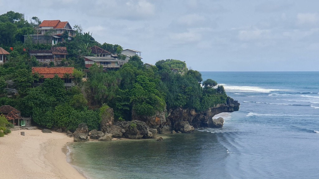 Das Hotel Jungwok Blue Ocean in Gunungkidul kombiniert Santorini-Ästhetik mit Strandnähe. Die weiß-blaue Architektur mit Runddächern und mediterranem Design wird oft als „Santorini von Gunungkidul“ bezeichnet. Es liegt direkt am Strand auf einem Hügel mit Blick auf den Pantai Jungwok und auf das ikonische Felseninselchen „Pulau Kalong“ im Meer. Die Lounge- und Essbereiche haben Meerblick, einzelne Zimmer private Pools - eine Atmosphäre wie in einem Bali-Beachclub.