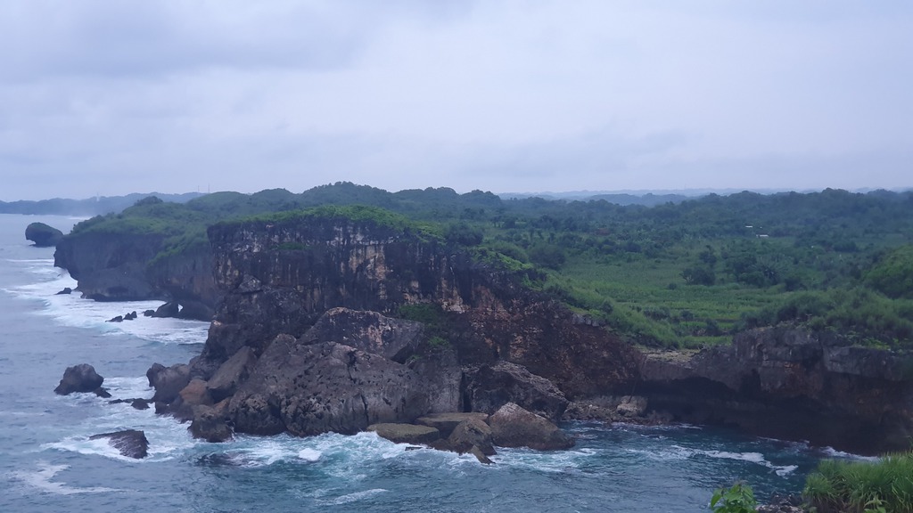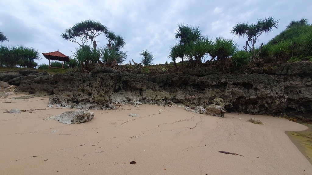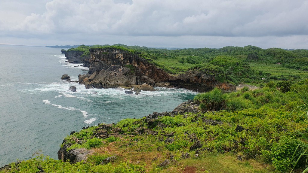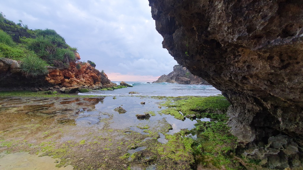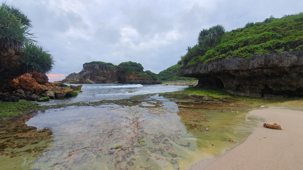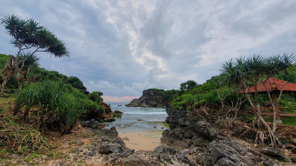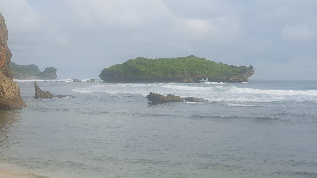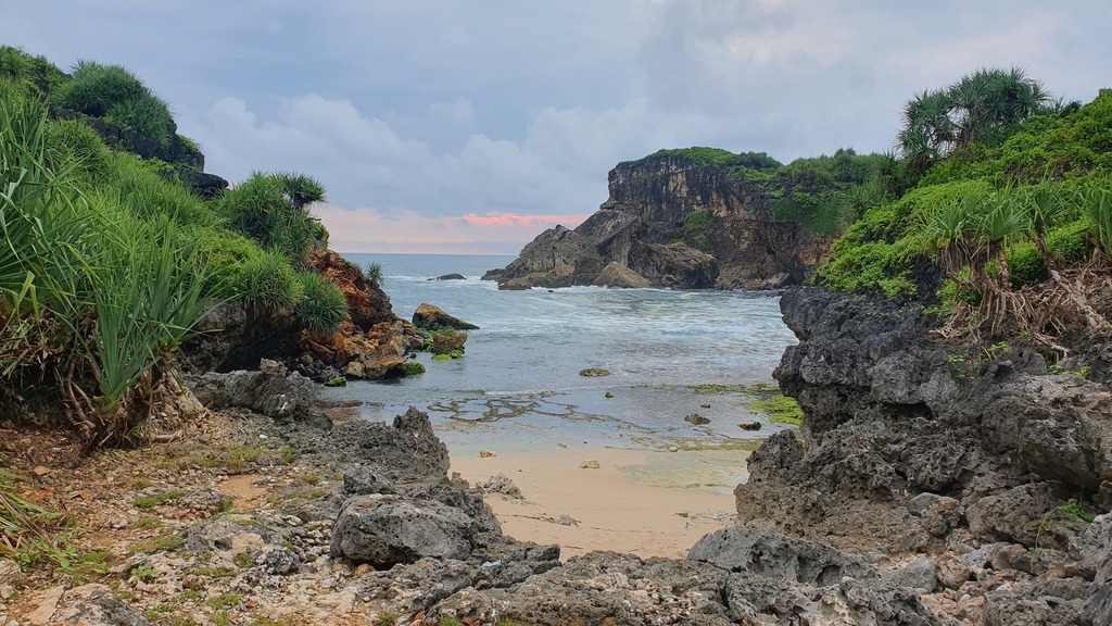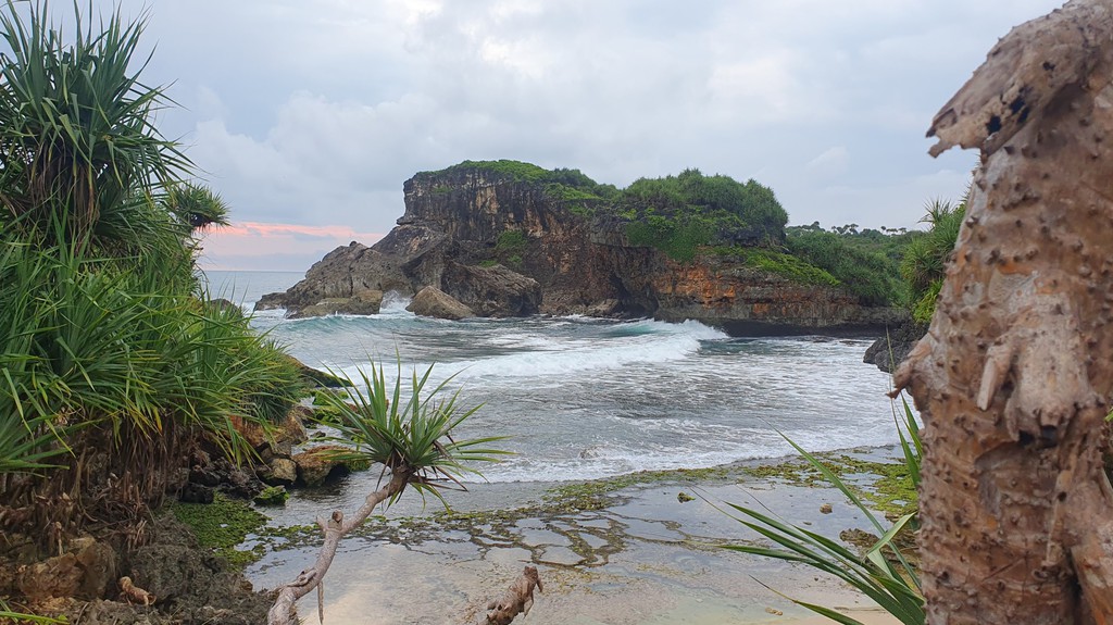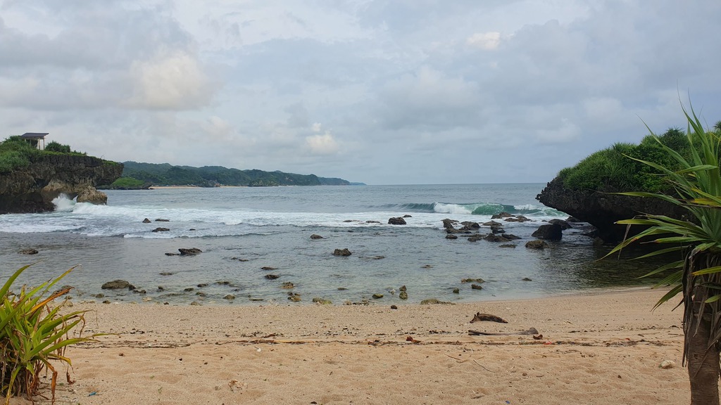 Der Pantai Nampu gilt als einer der schönsten und ruhigsten Strände der Südküste Zentraljavas mit natürlicher Atmosphäre, weißem Sand und markanten Karstformationen.- Umgeben von grünen Hügeln und Pandanus-Pflanzen, die Schatten und Duft spenden. Ruhige, meditative Atmosphäre mit drei durch Karsthügel getrennten Strandabschnitte.
