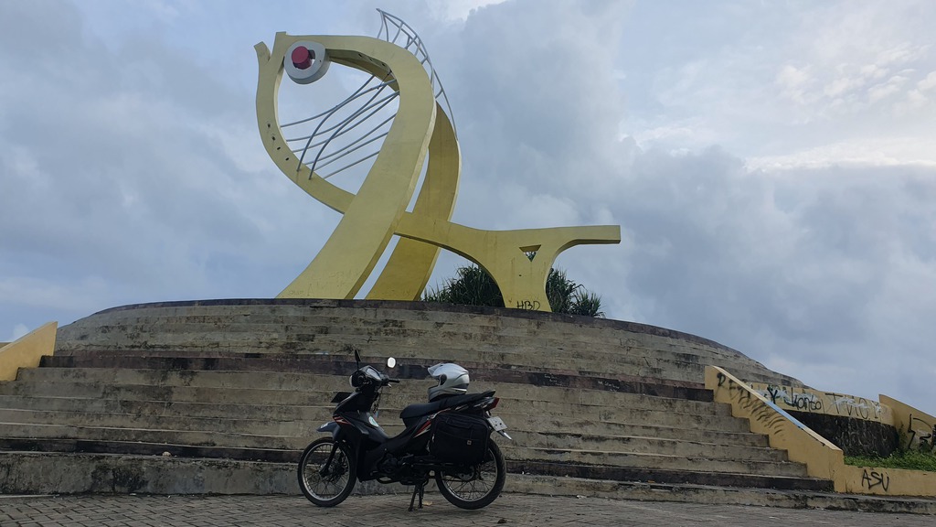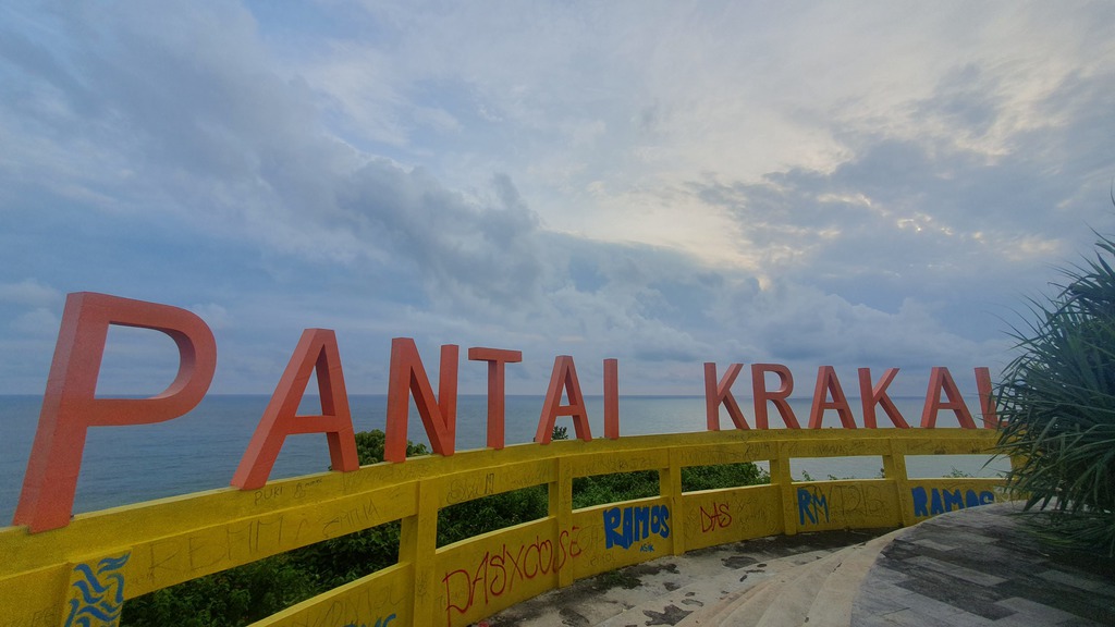 Der Pantai Krakal zählt zu den schönsten und längsten Stränden in Gunungkidul und bietet eine beeindruckende Kombination aus Natur, Geologie und Freizeitmöglichkeiten. Feiner, weißer Sand und große schwarze Karstfelsen ragen ins Meer und bilden natürliche Stege, eine ikonische Fischstatue auf einem Felsen dient als beliebter Fotospot